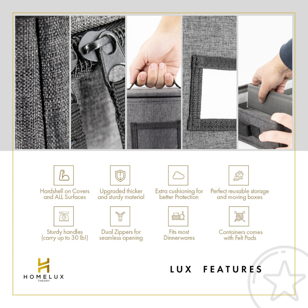Our fine china storage containers hard shell sets allow you to customize your storage requirements using adjustable and removable dividers. Protecting heirloom china pieces, planning for seasonal parties, or just staging your kitchen? Chinese storage boxes keep your pieces safe for the long haul. Made with eco-friendly materials, they are reusable as well as suitable for small homes or large sets. Moisture-resistant interiors, padded interiors, and durable exteriors make our boxes built for durability as well as convenience. Homelux Theory makes it easy to choose the best china storage containers for whatever the occasion requires—sleek, stackable, and practical cases for the best of your dinner sets.