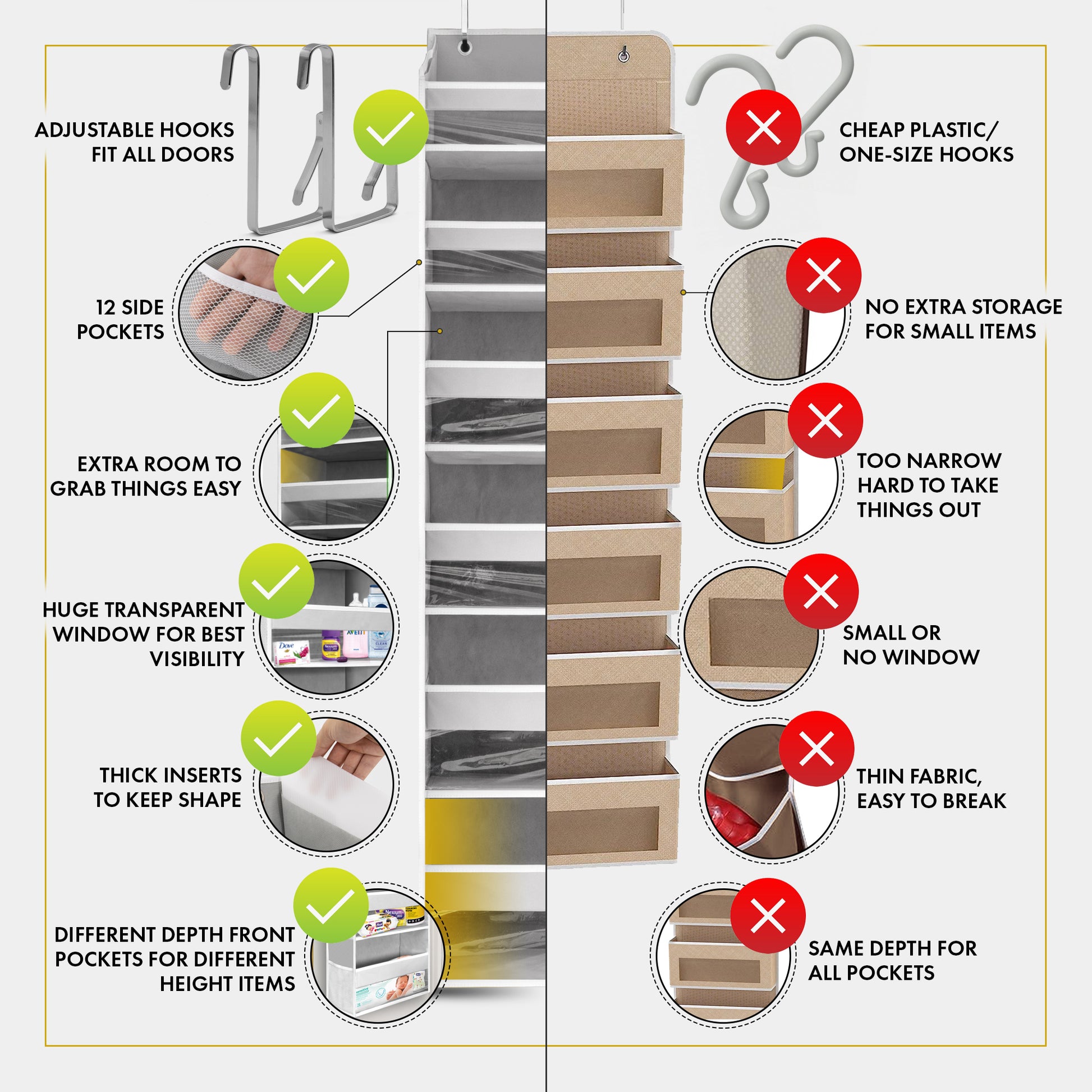 ✅ EXTRA ACCESSORIES✅- To ensure the stability of our over the door storage we have hook & loop strips that can be attached at the back of your organizers.