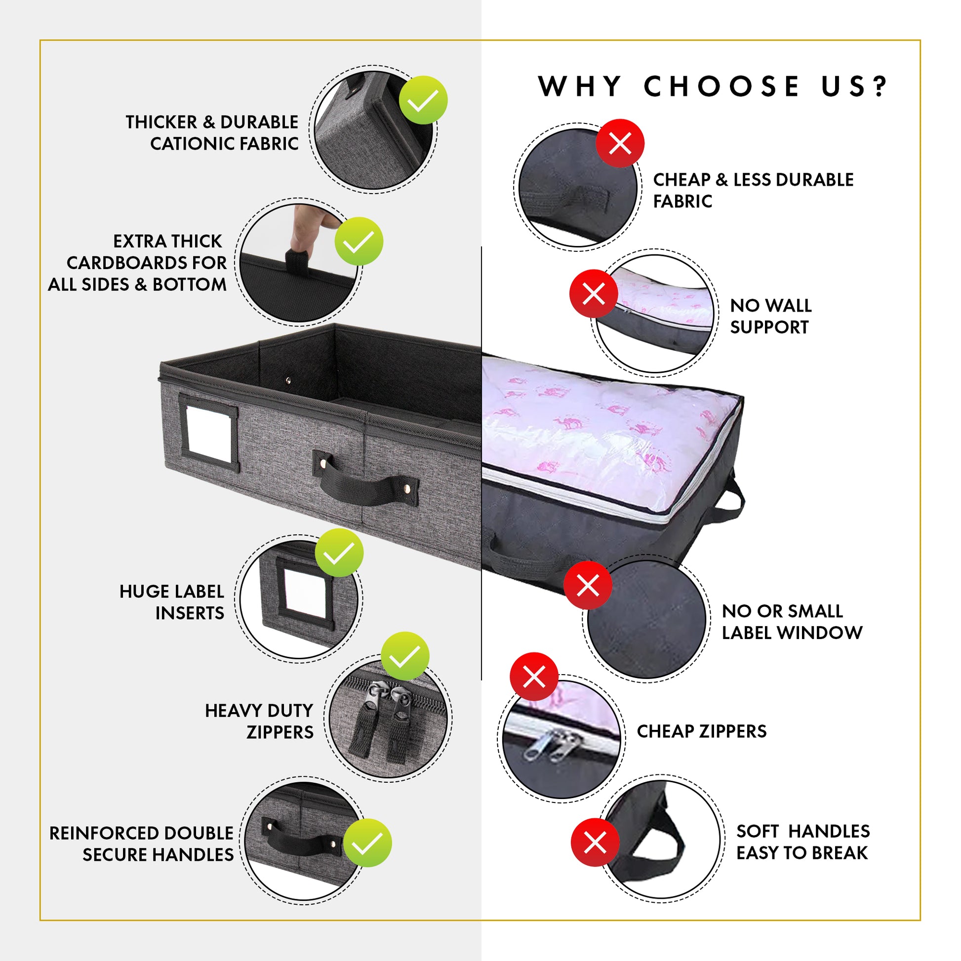 ✔️EXTRA THICK STURDY CARDBOARDS✔️- Unlike most other brands, our under the bed storage containers come with extra thick cardboard in each side and bottom part to help hold their shapes and withstand frequent use and heavy loads. Other storage under bed in the market usually has flimsy sides that are made of thin, lightweight materials that will not hold up well over time and definitely not for long term use.